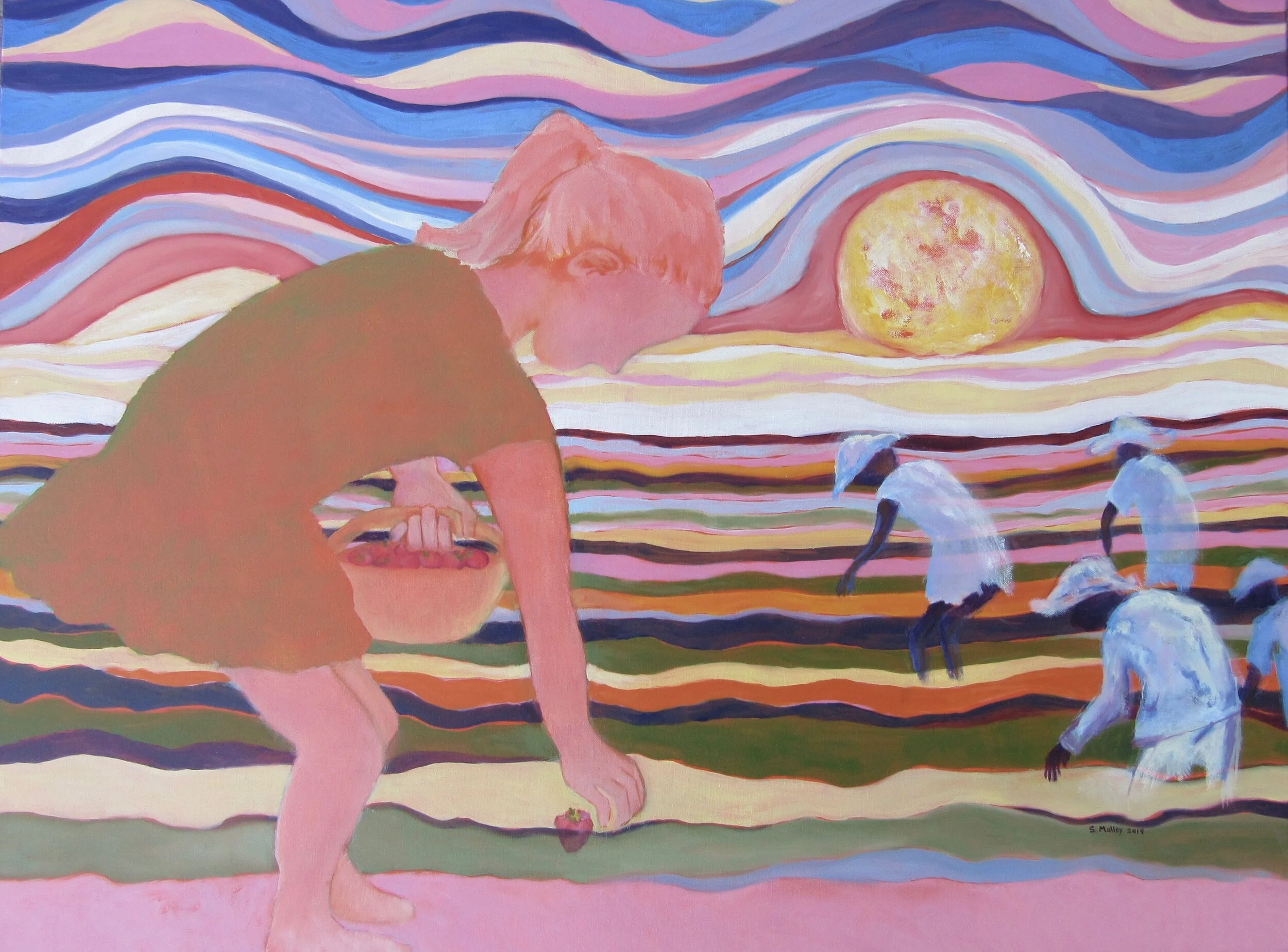 Malley’s work reflects these concerns in different ways. Many of the figurative paintings depict children of different races together, sharing the pleasures of picking berries, jumping rope, or playing games. These paintings have a dreamlike, almost whimsical quality. Sharon told me that in their innocence, she and her friends were able to examine their differences—say, the various textures of their hair – with complete abandonment. But then there were times when she came up against the customs and unwritten rules that adults used to place limits on those friendships.