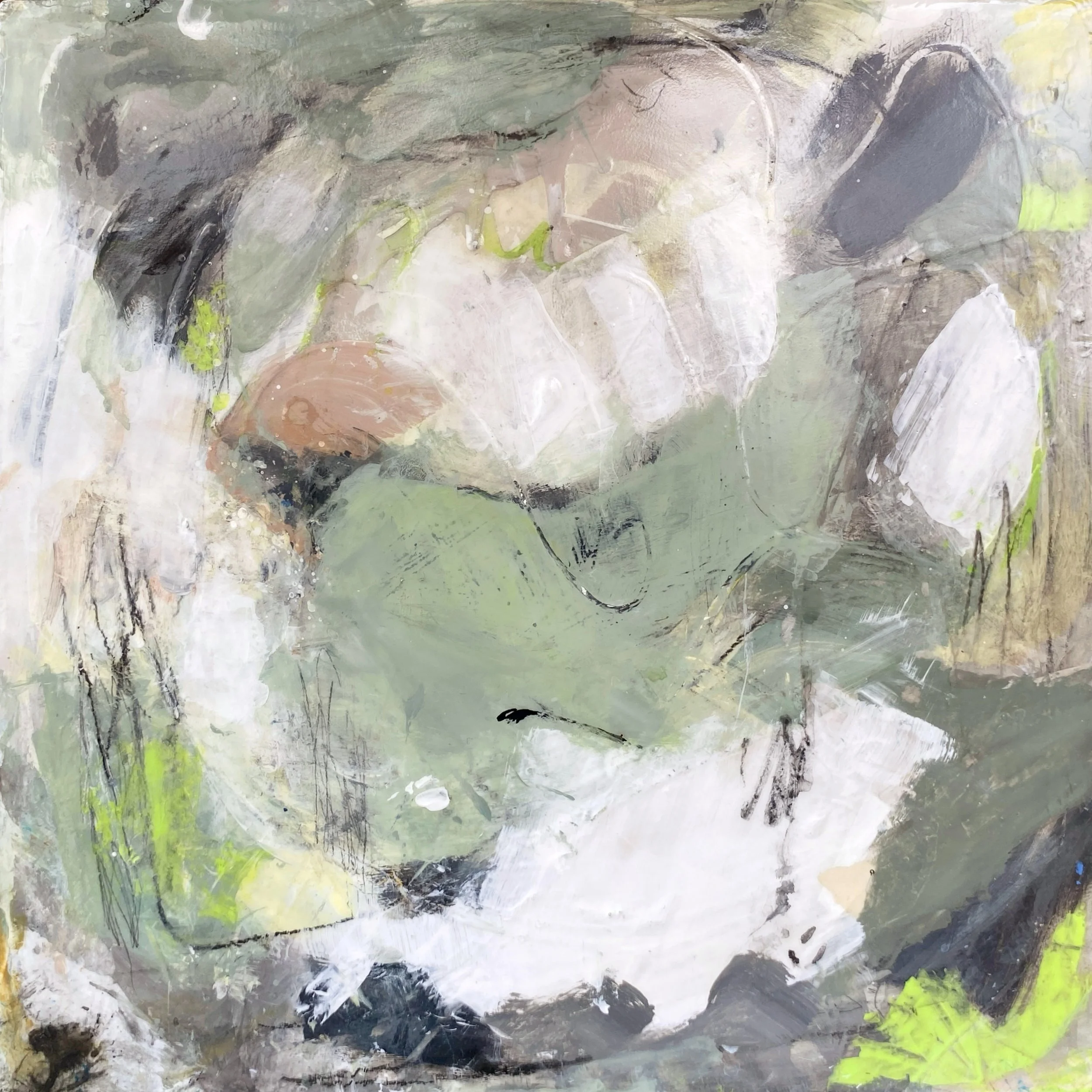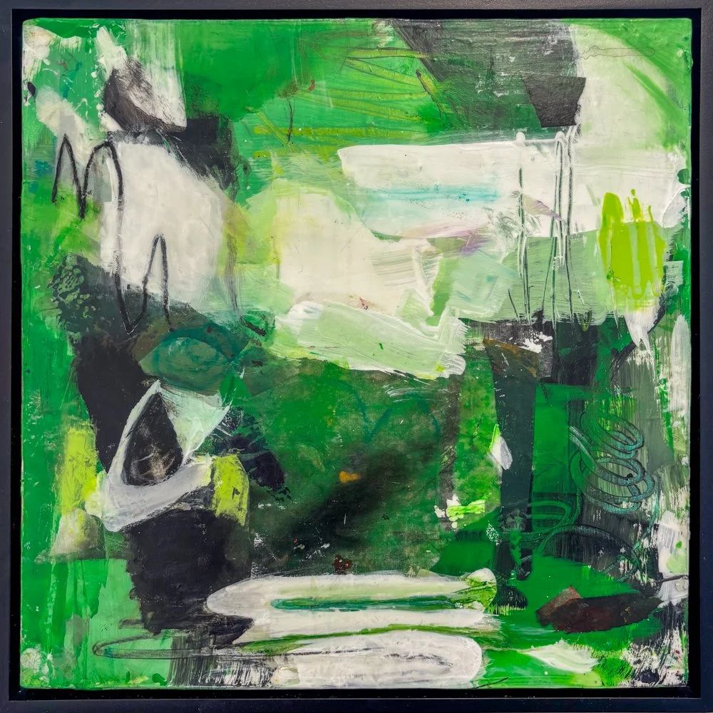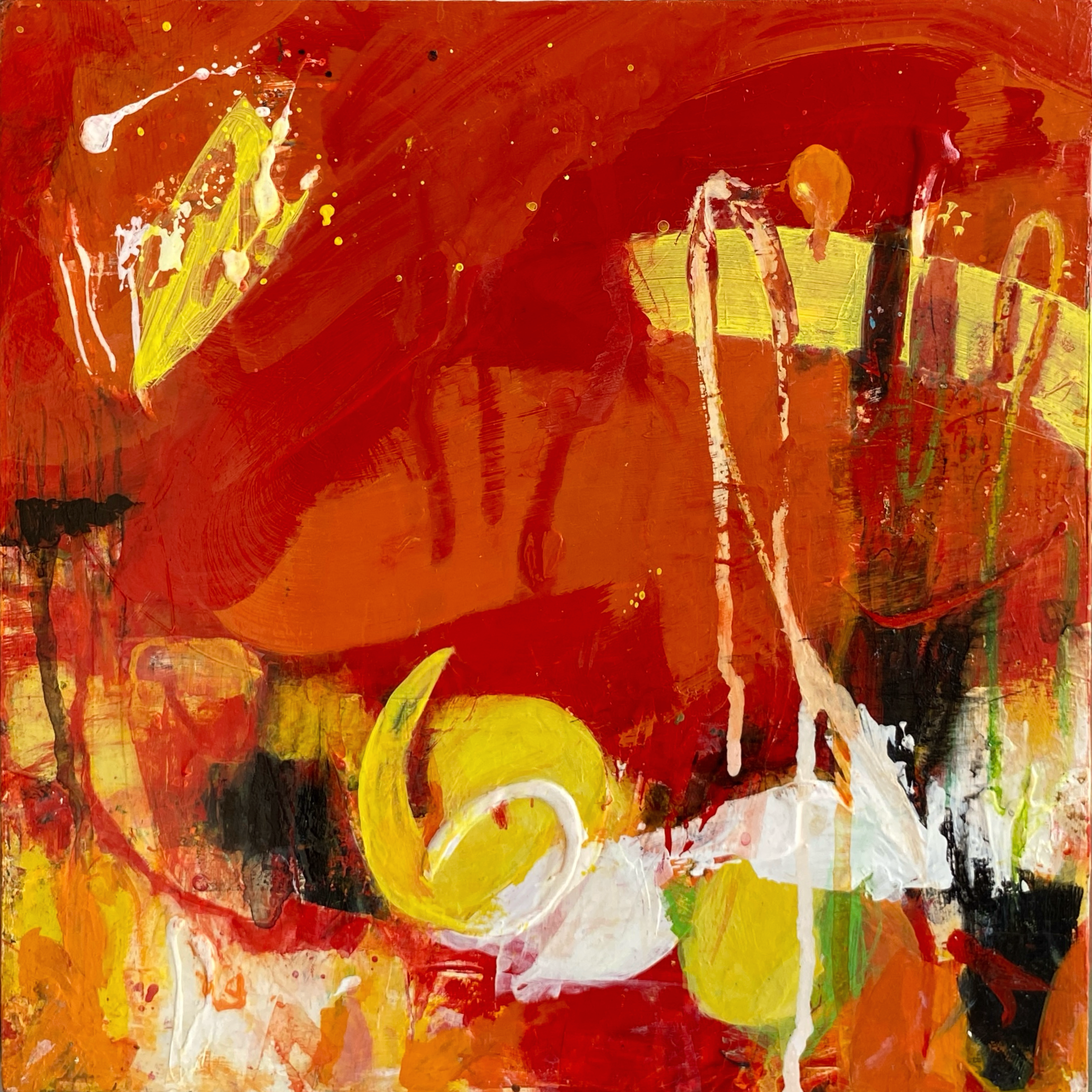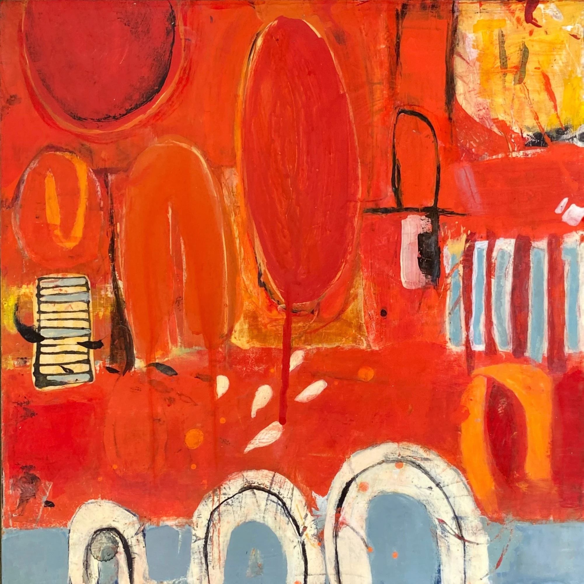 Typically working in acrylic and collage on birch board, she strives for viewers to be excited by her work’s strong design, multidimensional color relationships, and subtleties that reveal themselves on closer inspection. The viewer partakes in an unfolding relationship with the work, discovering new treasures with repeated engagement, emotionally rewarded for their acceptance of an invitation bursting with life. She will continue to work with a painting, creating and destroying and creating again, until in the work’s presence she feels fully alive to its communication and purpose.